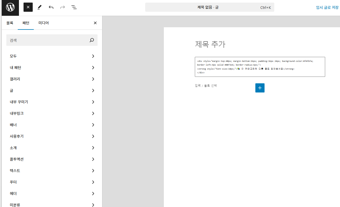 워드프레스에 없고 티스토리만 있는 '서식' 기능은 많은 쓰는 html 자동 패턴을 저장해 두었다가 포스팅할 때마다 꺼내쓸 수 있기 때문에 편리하다고 생각하고 있었다. 즉 워드프레스는 '노가다'를 많이 해야하는 구나!! 라고 느낄 무렵..